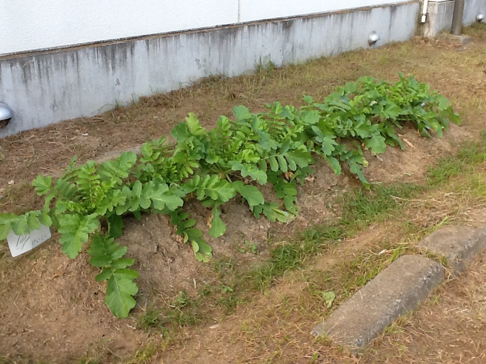 小学部1年生が9月上旬に種まきをした大根。すくすく育って、今は青首のところを見ると人参くらいの太さになっています。種の入っていた袋に「耐寒 総太り」と書いてあったので、その通りになってくれればいいのですが・・・。12月に収穫する予定です。
