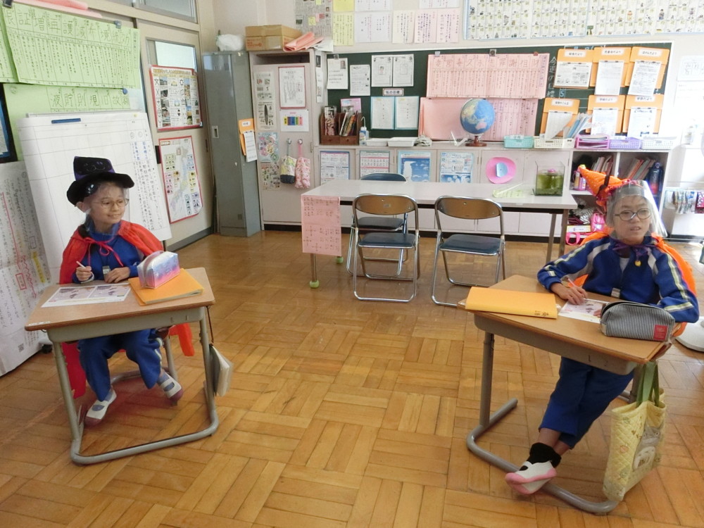 10月27日火曜日、小学部5年生の英語の授業は、異文化理解と行事に関する英語表現の理解を目標に、ハロウィンについて学習しました。ハロウィンの衣装を身に着け、飾りつけを施した教室で、ハロウィンやハロウィンで用いる英語表現について楽しい雰囲気の中、学習を進めました。ハロウィンが10月31日に行われること、「トリック オア トリート」などの英語表現、ハロウィンにまつわるキャラクターなどについて、クイズ形式を取り入れて学習しました。2人の児童は、積極的に手を挙げて発言し、実際のアメリカのハロウィンの様子をスライドで見るなど、ハロウィンに対する理解を深めることができました。