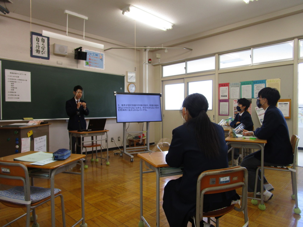 3年2組が10月26日㈪から11月6日㈮の2週間、第Ⅱ期現場実習に行きます。実習に先立ち、「がんばろう会」を行いました。生徒からは事業所の作業内容の紹介や目標等についての発表と、力強い決意表明がありました。校長先生からは激励のことば、教頭先生からはメッセージが送られました。2週間の実習で生き生きと経験を重ね、また学校でさらに成長した姿で会えることを楽しみにしています。