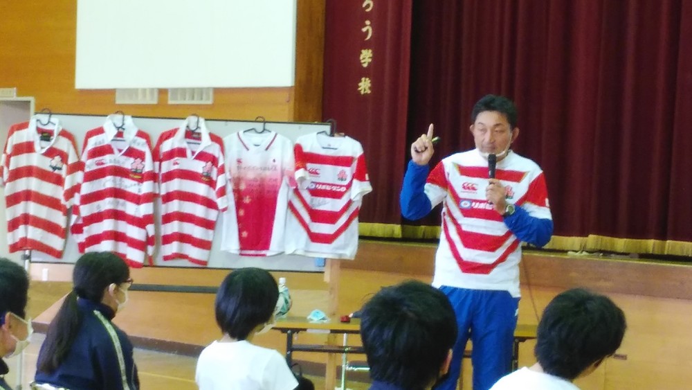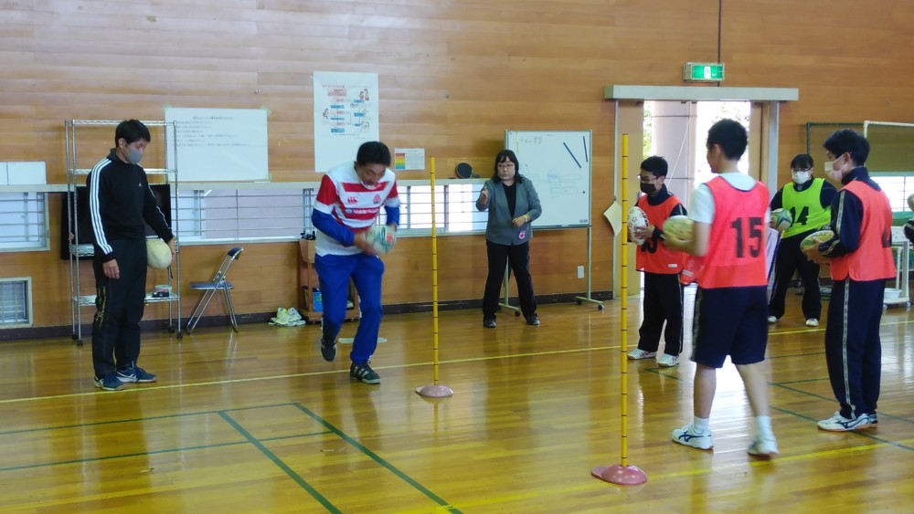 山梨県立ろう学校 > 活動の様子 > 中・高等部 オリンピック・パラリンピック教育推進事業(ラグビー) 2020年11月16日カテゴリー: 活動の様子 中・高等部 オリンピック・パラリンピック教育推進事業(ラグビー) 11月16日(月)の午後、オリンピック・パラリンピック教育推進事業の一環として、元ラグビー日本代表 現山梨学院大学ラグビー部監督の梶原宏之氏を講師にお迎えし、ラグビーの説明やラグビー体験が行われました。ラグビーの説明では、昨年日本で開催されたラグビーワールドカップや日本代表で活躍されていたころのお話、ラグビーを行う上で大切にしていること等、写真やクイズを交えながら楽しくわかりやすく話をしてくださいました。また、ラグビー体験では、セフティーマットの上にトライしたり、タックル練習用具にタックルしたりするなどの体験をさせていただきました。生徒はとても熱心に思い切って体を動かしながらラグビーの面白さを体感することができました。