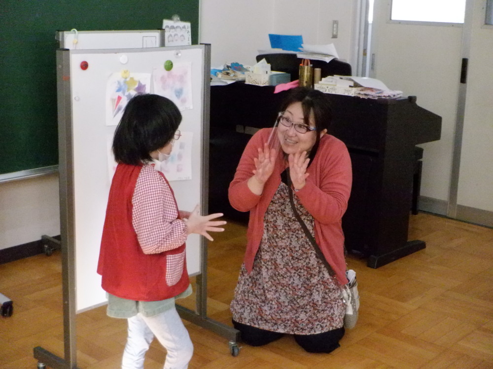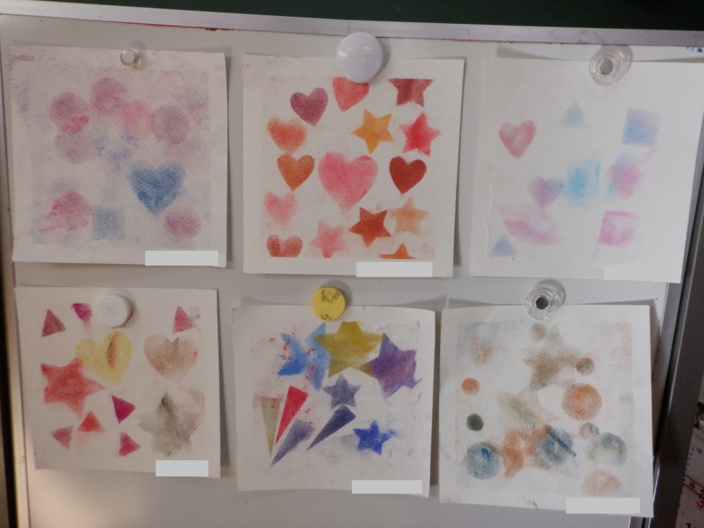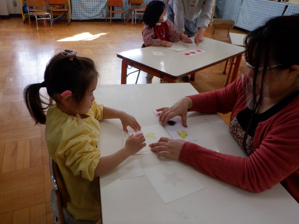 パステルを削って粉にしたものを✰や♡の型紙に指でこすりました。それぞれがパステルの粉のふわっとした軽い感触を味わっていました。すてきな色合いの作品が完成して、子どもたちもうれしそうでした。