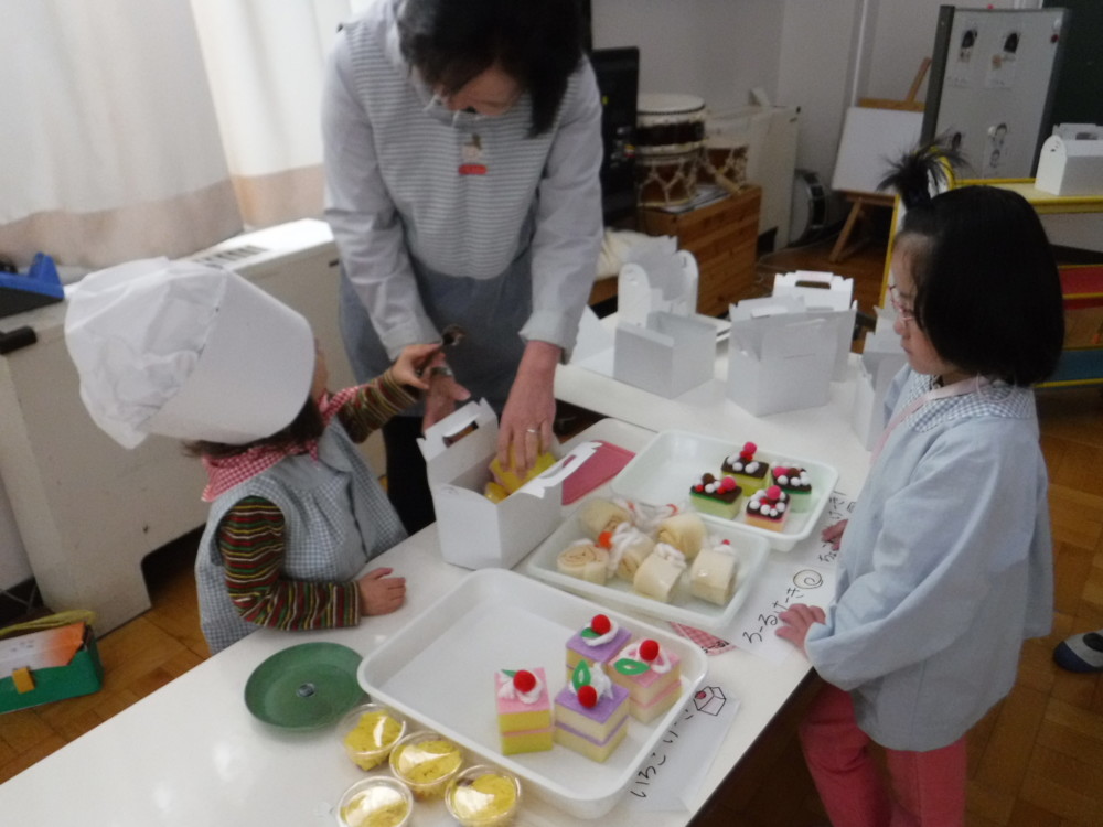 「〇〇をください」「ありがとうございました」など、商品やお金の受け渡しのやり取りをしながら、お店の仕事や買い物を楽しみました。