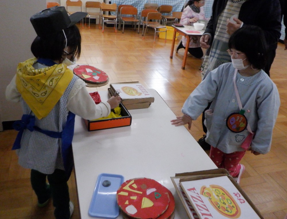ケーキ屋さん、ラーメン屋さん、ピザ屋さんです。お店屋さん役、お客さん役になって遊びました。