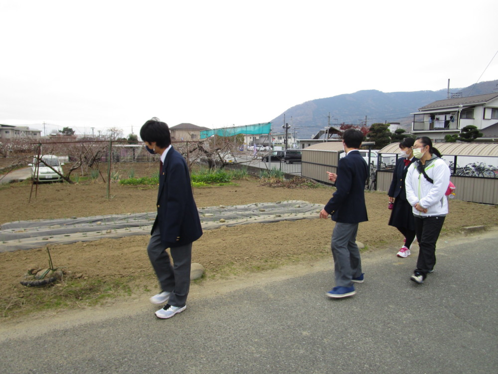 高等部では、生徒、教師が校外に出て、学校―春日居町駅間の通学路を実際に歩き、危険個所等について確認しました。植栽等で死角となる箇所、側溝の蓋がない箇所、交差点等を1カ所ずつ丁寧に確認しました。また、緊急時の連絡先及び避難先となる「こども110番」の住宅についても確認することができました。冬季の帰宅時は通学路は非常に暗くなるため、ネックライトの使用が必要となります。ご家庭でも交通安全について話題に挙げていただけるますようお願いいたします。