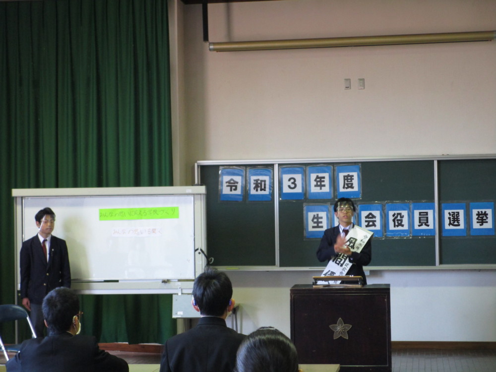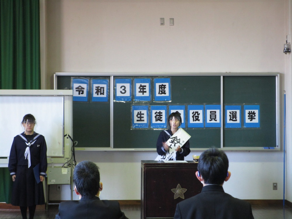 令和3年度 生徒会役員選挙が12月7日(金)に行われました。立候補者や推薦者の演説はどれもすばらしかったです。生徒の皆さんの演説を聞く態度もすばらしかったです。投開票の結果、新会長に風間優汰さん、新副会長に鈴木ゆらさんが当選しました。おめでとうございました。みんなで協力し、よりよい学校を作っていってほしいと思います。なお投票箱も実物を市役所からお借りして投票を行いました。