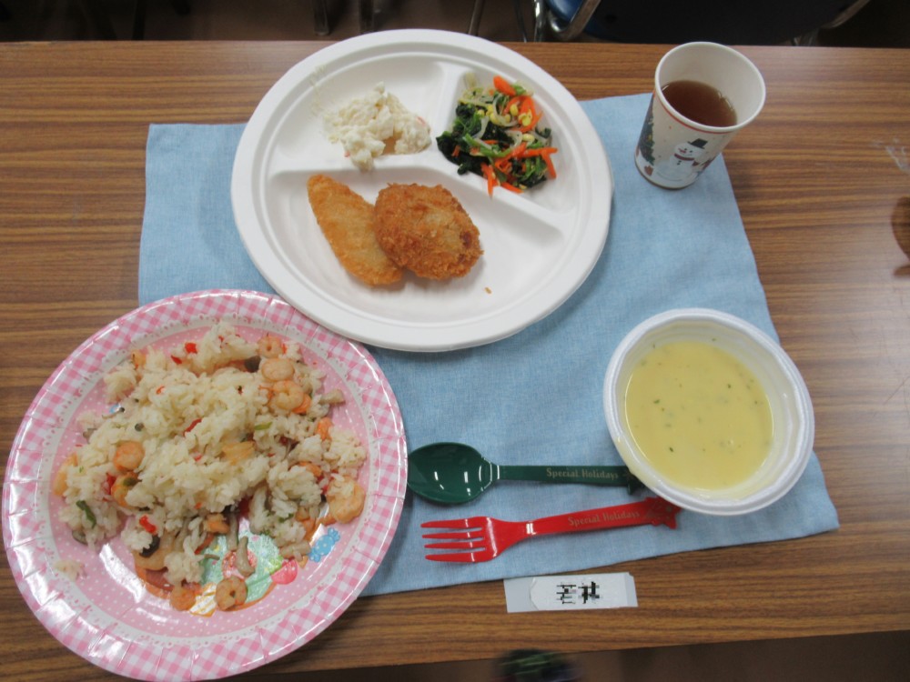 食事中は残念ながら食べながらの会話が難しいので、オルゴール曲のBGMをかけて食べたり、食堂をクリスマスの雰囲気が出るような飾りを装飾したりして雰囲気を楽しみました。