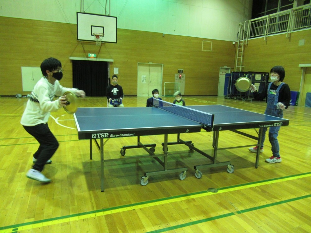 レクリエーションはおもしろ卓球をしました。様々なラケット(鍋、バット、スリッパ、フリスビーなど)を使用して試合をしました。コロナ感染症対策として、道具の使用時にビニール手袋を使用したり、体育館の窓を開けて換気したりして取り組みました。