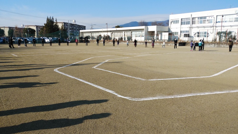 山梨県立ろう学校 > お知らせ > ドローン撮影をおこないました 2021年1月7日カテゴリー: お知らせ ドローン撮影をおこないました 1月7日、本校グラウンドにてドローン撮影(空撮)をおこないました。本校は来年(令和4年)に創立100周年を迎えます。その一環としまして、本校の幼児生、職員、ご希望の保護者の方など、90名ほどで撮影をおこないました。グラウンドに大きく白文字で「100」と描き、それを全員で囲むように並びました。ドローンをみんなで見上げて両手を振って撮影しました。仕上がり写真が楽しみです。撮影後は会社の方にドローンの機材を見せていただき、皆さん興味津々でした。