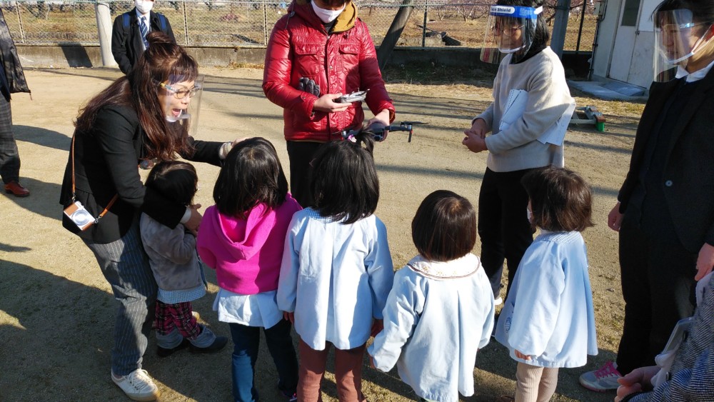 1月7日、本校グラウンドにてドローン撮影(空撮)をおこないました。本校は来年(令和4年)に創立100周年を迎えます。その一環としまして、本校の幼児生、職員、ご希望の保護者の方など、90名ほどで撮影をおこないました。グラウンドに大きく白文字で「100」と描き、それを全員で囲むように並びました。ドローンをみんなで見上げて両手を振って撮影しました。仕上がり写真が楽しみです。撮影後は会社の方にドローンの機材を見せていただき、皆さん興味津々でした。