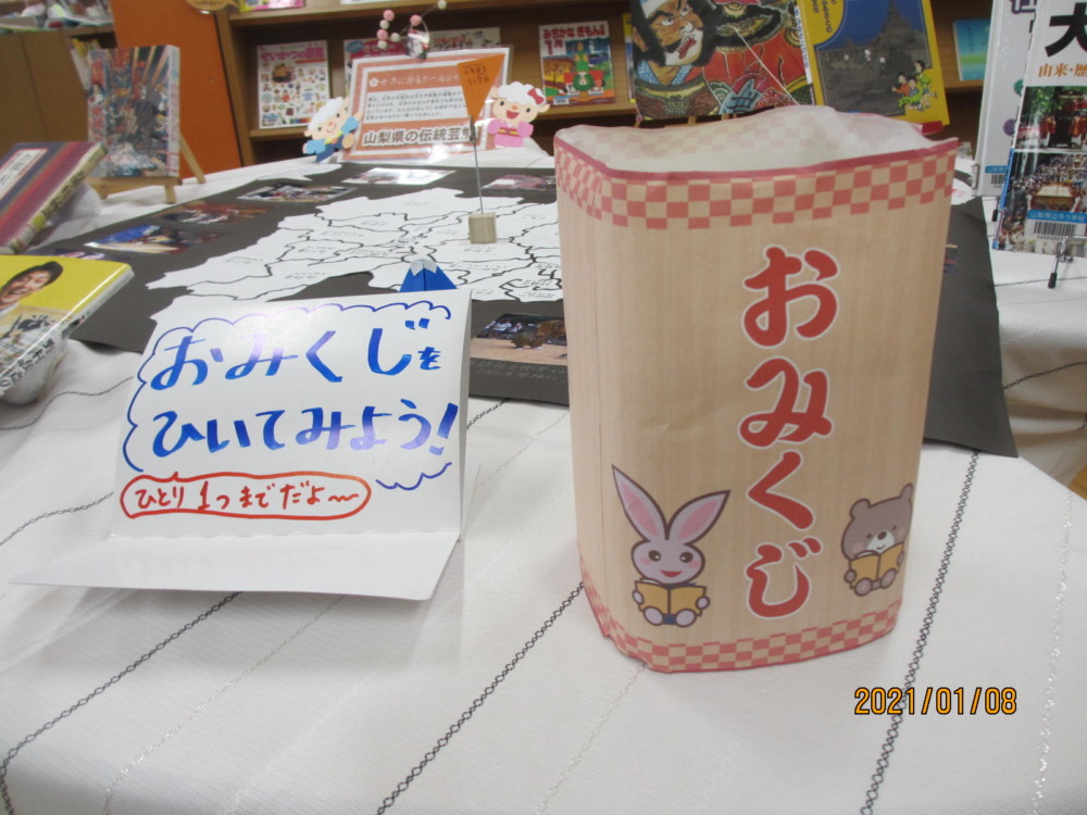 山梨県立ろう学校 > 活動の様子 > 年の初め(図書室) 2021年1月8日カテゴリー: 活動の様子 年の初め(図書室) 年の初めの「本が読みたくなるおみくじ」が 図書室にお目見えしました。 図書の返却に来た幼児生が 今年も素敵な本と出会えますように 図書教養係一丸となって お待ちしております。 初日の7日は大勢の幼児生がおみくじを引き 「大吉!」「えー!」「あの本を読んでみたいな」と いろいろな会話が飛び交っています。 素敵な本との出会いがおとずれますように。
