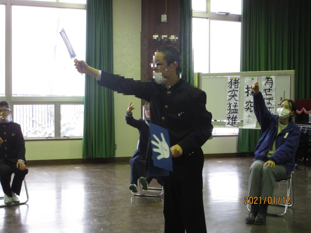 山梨県立ろう学校 > 活動の様子 > 中学部集会 2021年1月13日カテゴリー: 活動の様子 中学部集会 1月12日(水)の6校時に、中学部集会を行いました。2年生3名が、2学期の終わりから話し合って準備を進めてきた集会です。まずは、筆にしたためた新年の目標を発表しました。次はゲームです。新年にちなんだ「〇×クイズ」は、大人でも「へー。」と思えるような内容でした。ゲーム二つ目は「じゃんけんバスケット」です。最初はオニにならないように、空いている椅子をめがけて必死に座っていた生徒たちでしたが、「オニも楽しそう」ということに気づき、オニになりたくて席を譲り合う場面もみられ、笑いを誘いました。生徒も教師も楽しめるゲームとなりました。 最後は引継ぎ式で、3年生から下級生への言葉がありました。たった一人の3年生で中学部を引っ張るのは大変だったこと、でも生徒7人で活動することはとても楽しかったことなど、たくさんの思いが伝わってきました。下級生はその思いをしっかりと引き継ぎました。
