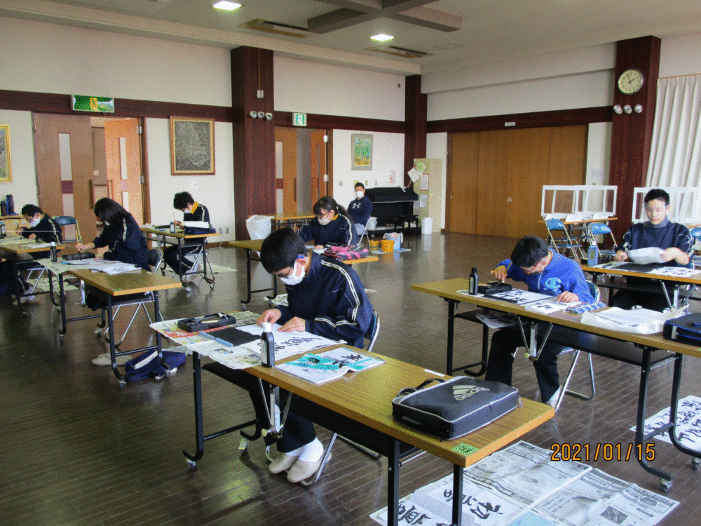 1月15日(金)の午後、中学部校内書きぞめ大会が実施されました。1年生「初夢」2年生「山紫水明」3年生「和気致祥」の教育祭の課題に取り組みました。中学生は行書で書きます。どの生徒も手本をしっかりと見て、字の大きさやバランスなどを考えながら書いていました。呼吸を整えたり目をつむったりして集中力を高めてから書く生徒もいて、書に向き合っていることが感じられました。どの作品も素晴らしく、校内での審査会が楽しみです。