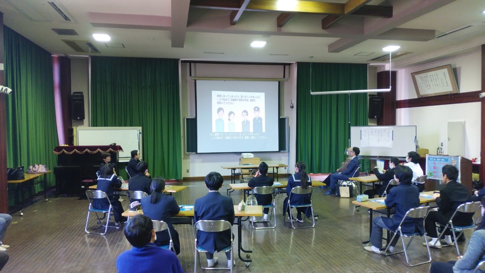 中高等部では、防犯教室を実施しました。日下部警察署の生活安全課の方にお越しいただき、SNSの注意点や護身術、さらに110番アプリについてお話をうかがいました。情報化社会の一員としての自覚を持つよい機会となりました。日下部警察署の皆さん、大変ありがとうございました。
