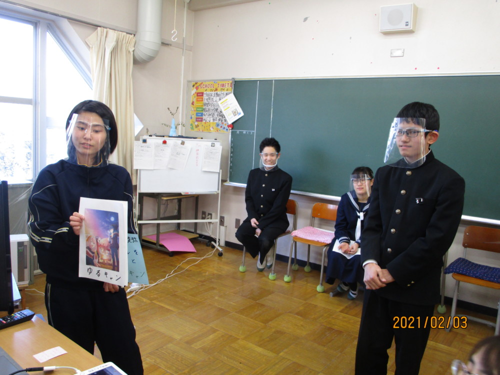 2月3日(水)の放課後、今年度最後の交流及び共同学習が行われました。今回もオンラインでの実施でした。趣味や好きなアニメについてのやりとりでは、「ゆるキャンが好き。」と画像を準備して答えた本校の生徒に対して、さらに「好きなキャラクターは?」と質問がありました。思いがけない質問に、緊張しながらも恥ずかしそうに答えていました。「コロナが収まったら何をしたいか。」というテーマでは、「鬼滅の刃の映画を見に行きたい。」という話になり、とても盛り上がりました。