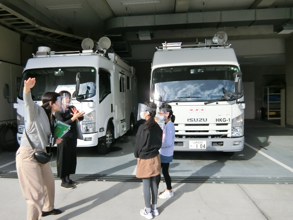 社会科見学で、NHK甲府放送局に行きました。「テレビかできるまで」を学習し、アナウンサー体験もしました。中継車も見せてもらい、ニュースや番組づくりの大変さを学びました。