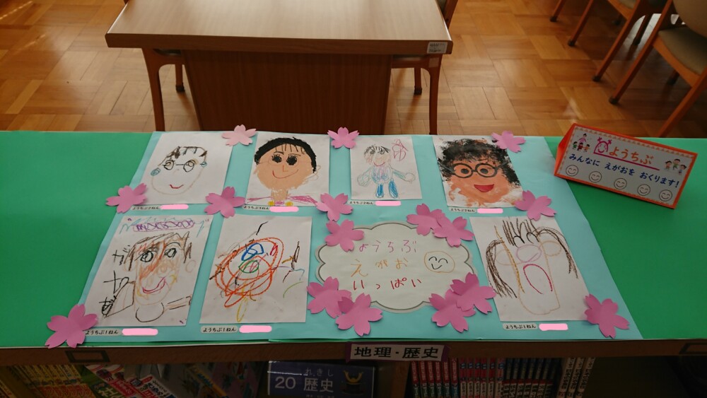 展示は図書室で行っていますのでかわいらしい笑顔を受け取りにきてください。