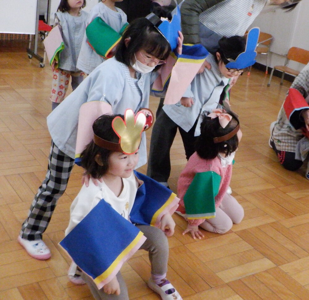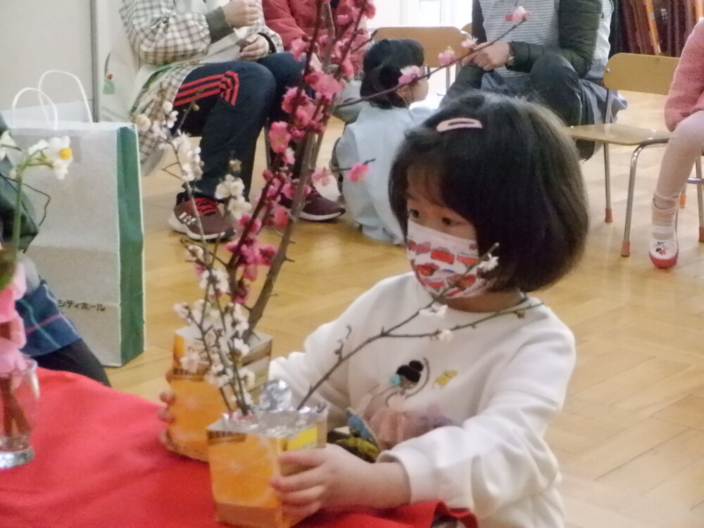 幼稚部でひなまつりをしました。ひなまつりのお話をきいた後、家からもってきた梅や桃などをひな人形に「おひなさま、どうぞ」と言ってお供えしました。その後、「うれしいひなまつり」の歌を踊ったりひなまつりゲームをしたりしました。花がいっぱいの華やかなひなまつりになりました。