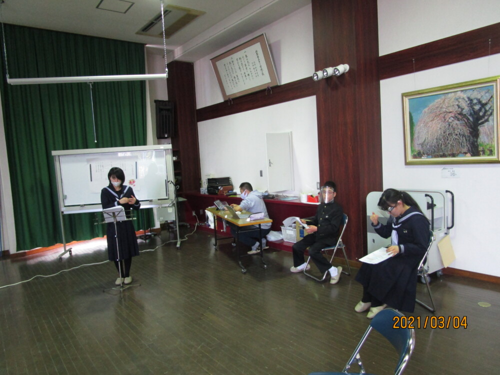 山梨県立ろう学校 > 活動の様子 > 中学部 卒業生を送る会 2021年3月5日カテゴリー: 活動の様子 中学部 卒業生を送る会 3月4日(木)5校時に中学部の卒業生を送る会を実施しました。2年生の3名が企画・運営として、話し合いを重ね、メッセージカードを集めて色紙に貼ったり、3年間の写真をPowerPointにまとめたりしました。会の始まる直前まで、進行台本に目を通して、自分の担当を確認する姿がみられました。 PowerPointのスライドはクイズ形式になっていて、卒業生だけでなく、在校生も教員も楽しめる内容でした。 1年生の3名は、感謝の気持ちを伝え、色紙と花束を渡しました。 卒業生からは、入試の体験を通してわかったことをぜひ伝えたいと、後輩へたくさんのアドバイスをしてくれました。 温かい気持ちになる、よい会となりました。