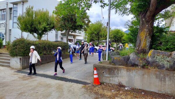 本校では、安全対策のため、今年度も年3回防災避難訓練を実施します。第1回避難訓練は、火災発生の想定で行いました。どの学部も真剣に静かに落ち着いて避難することができました。避難する様子は、本校がある大野地区の方々にも見ていただきました。避難終了後は、大野地区の代表の方に講評をいただき、「先生の指示に従って、安全に避難できていました。」とほめていただきました。
