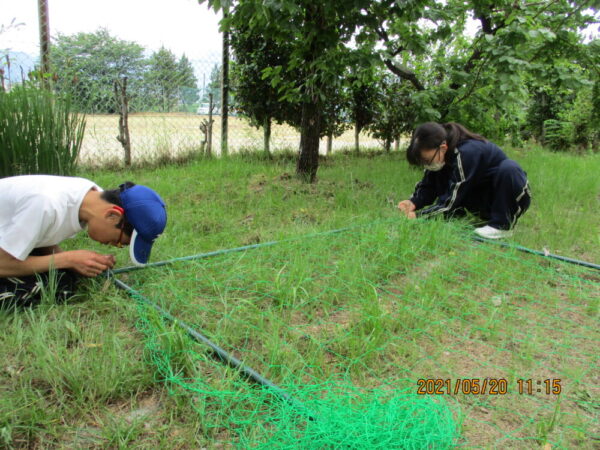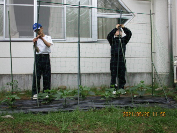 3年生の生徒2名が、協力して支柱を立て、ネット張りも行いました。どのようにしたらよいのかを、じっくり相談してからの活動です。