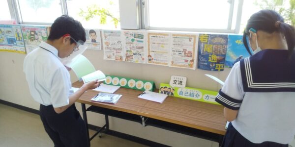 春日居中学校の自己紹介カードは、中学部棟の廊下に掲示してあります。さっそく生徒が手に取り、熱心に読んでいました。