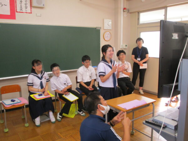 山梨県立ろう学校 > 活動の様子 > 春日居中学校との交流及び共同学習~オンライン~ 2021年6月18日カテゴリー: 活動の様子 春日居中学校との交流及び共同学習~オンライン~ 6月17日(木)の放課後の時間を使って、中学部と春日居中学校との交流及び共同学習を行いました。 本校生徒は6名、春日居中学校は福祉交流委員会の約30名です。一度に会話をするのは難しいので、今回も、クラスごとにやりとりをしました。春日居中学校の3-1と本校の生徒1名のトークでは、「趣味」がテーマでした。本校の生徒が「オリンピックを見るのが楽しみです。」と、自作の絵を提示しながら話すと、水泳やボクシングのイラストに気づいてくれて、やりとりも盛り上がりました。 福祉交流委員会の生徒は、手話や指文字を覚えて伝えてくれました。本校の生徒も、音声や手話だけでなく、絵や文章を書いたものを提示して、できるかぎり自分の力で伝えようと取り組みました。 次につながる交流及び共同学習になったと思います。