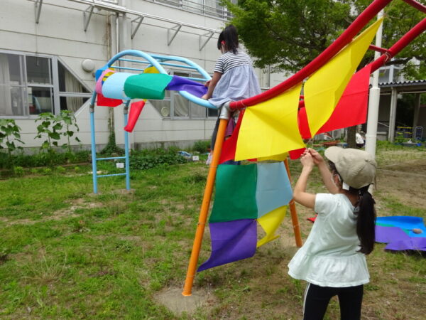 図工の授業で、好きな色の布を選び、布と布をひもでつなぎ合わせ、中庭のうんていを飾りつけました。