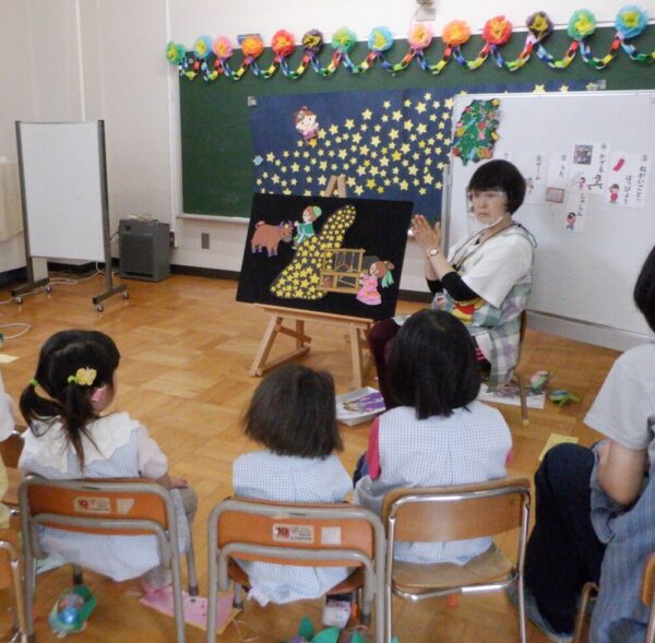 幼稚部で七夕行事をしました。七夕のパネルシアターを見た後、願い事の発表をしました。「トマトがたくさん食べたい」「きれいなドレスが着れますように」等、色々な願い事が書かれた短冊を笹に飾りました。みんなの願い事が叶うとよいですね。