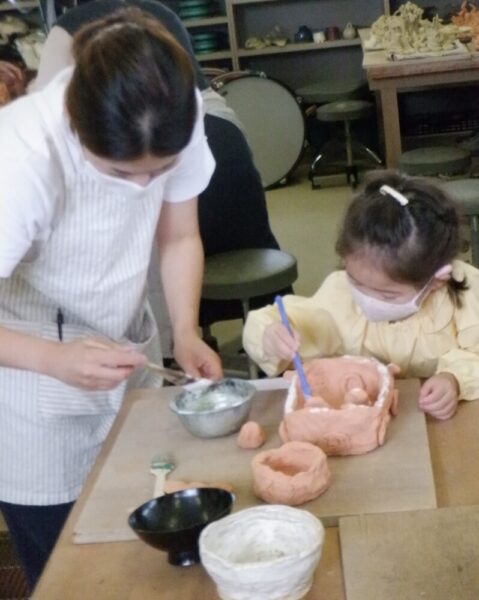 山梨県立ろう学校 > 活動の様子 > 幼稚部 陶芸教室 2021年7月7日カテゴリー: 活動の様子 幼稚部 陶芸教室 7月6日に親子陶芸教室がありました。5月に親子で作った作品を素焼きしたものに釉薬を塗りました。好きな色の釉薬を選んで筆や刷毛を使って塗りました。前回の陶芸教室に引き続き、講師の飯島先生に教えていただきながら、親子で協力して皿や入れ物やオブジェに色をつけました。本焼きをして、どんな色の作品に仕上がるのか、楽しみですね。