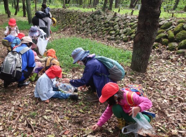 鯉に餌をあげた後、どんぐりやまつぼっくりを拾いました。たくさんどんぐりが落ちていたので、子どもたちは大喜びで夢中で拾って袋に入れていました。