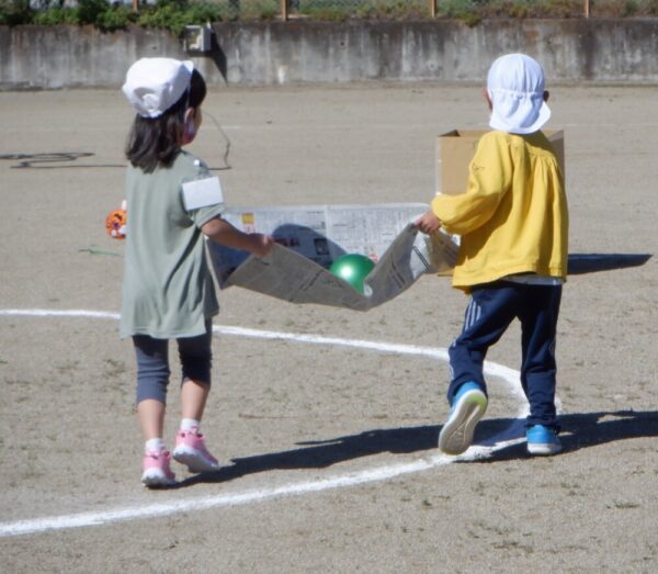 ボール運びでは、加納岩保育園の友達とろう学校の友達がペアになり、新聞紙にのせたボールを運びました。みんなで楽しく遊ぶことができ、よい交流になりました。
