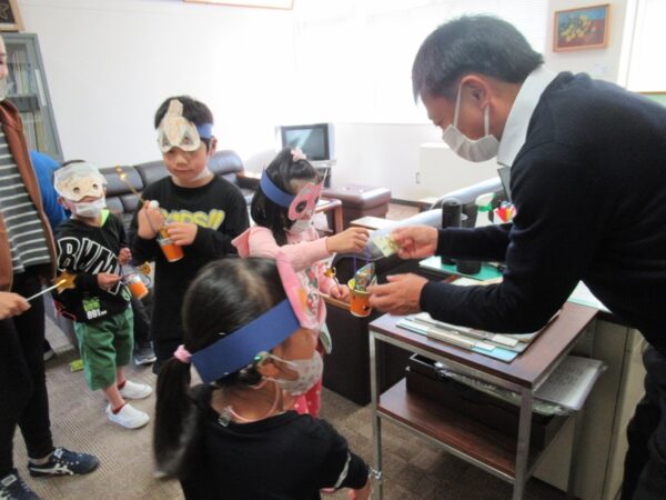 生活の時間に、1・2年生の4人で、仮面やお菓子を入れるカップ、星のついたさし棒などを作り、職員室、図書室、保健室、校長室、事務室の順に校内を巡りました。はじめに教わっていた通り「トリック オア トリート!」と叫んでおどかし、たくさんのお菓子をいただくことができました。