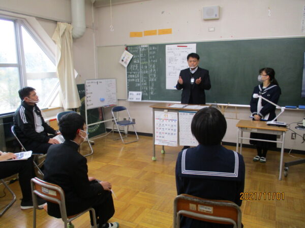 山梨県立ろう学校 > 活動の様子 > 中学部修学旅行 結団式 2021年11月2日カテゴリー: 活動の様子 中学部修学旅行 結団式 中学部3年生の修学旅行を11月4日、5日の一泊二日で行います。1日は結団式でした。団長の岩崎校長先生からお話をいただきました。川手教頭先生も、生徒の気持ちを盛り上げるようなお話をしてくださいました。そのあと、生徒が一人ずつ、修学旅行における学習や係などの視点で、自分の目標を理由も含めて発表しました。山梨県の自然や文化、歴史などの魅力を再発見する修学旅行になると思います。安全に楽しく、思い出いっぱいの修学旅行となることを祈っています。