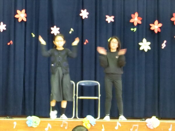 山梨県立ろう学校 > 活動の様子 > 小学部 音楽学習発表会 2021年12月8日カテゴリー: 活動の様子 小学部 音楽学習発表会 12月7日(火)小学部の音楽学習発表会が開かれました。 児童は緊張しながらも、いつも通りの演奏ができました。 音楽の楽しさが伝わってくる発表会でした。 1,2年生は、元気いっぱいリズムうちをしました。 3年生はリコーダーのきれいな音色を聞かせてくれました。 4年生は、楽しい劇を見せてくれました。 5年生は自分たちで作った曲を演奏しました。 6年生は、ボディーパーカッションを披露しました。