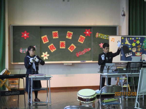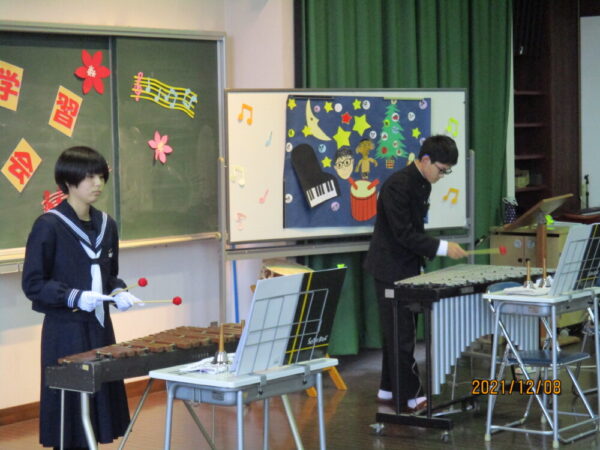 それぞれのクラスの発表では、ハンドベルやキーボード、リコーダー、太鼓、ピアノ、木琴・鉄琴など様々な楽器を使い、工夫を凝らし、素晴らしい発表をしました。聴いていた生徒や保護者、職員は演奏に聴き入っていました。