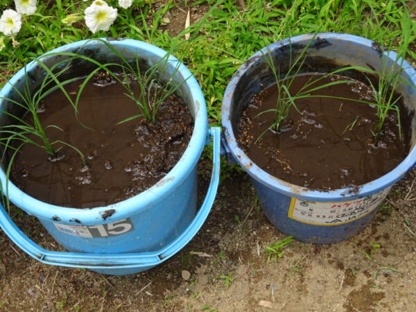 種もみから芽出しをさせ、種まきをし、苗の移し替えをしました。成長が早く、あっという間に育っています。泥を触ることに悲鳴を上げながら!?おいしいお米を作れるように、みんなで力を合わせていきたいと思