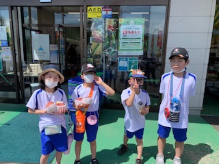 2・3年生の合同生活科で町探検に行きました。おいしい桃を買ってきました。