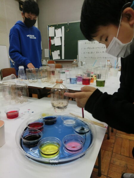山梨県立ろう学校 > 活動の様子 > 小学部 図工の授業より 2022年12月9日カテゴリー: 活動の様子 小学部 図工の授業より 小学部5年生の図工の授業の様子です。 色水+透明容器+子どもたちのアイデアで 楽しい、美しい瞬間を、たくさん発見できました。