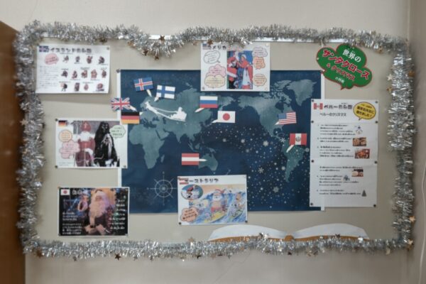 山梨県立ろう学校 > お知らせ > 世界のクリスマス(図書教養) 2022年12月16日カテゴリー: お知らせ 活動の様子 世界のクリスマス(図書教養) 図書室は入り口がクリスマスモード 日本ではツリーを飾って、ケーキやチキンを食べて、プレゼントをもらう。。。 そんな当たり前だと思っていることが、世界に目を向けると違うことが見えてきます。 食べもの、サンタクロース、トナカイ・・思っていたのと違うおもしろい ネタを掲示してみました。 図書室の奥に足を運んでみてください。