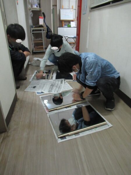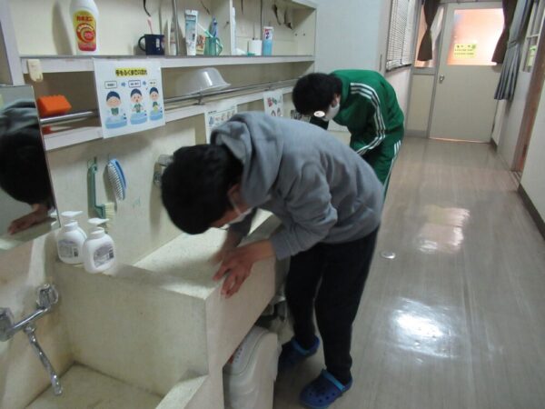 山梨県立ろう学校 > お知らせ > 寄宿舎 愛舎日 2022年12月21日カテゴリー: お知らせ 寄宿舎 愛舎日 寄宿舎では、普段掃除をしていない場所や物をきれいにする日として愛舎日を設けています。今年度第2回目は「洗面台周辺をきれいにしよう!」と題して、2人ずつのグループに分かれて洗面台と鏡の掃除をしました。グループで協力して洗剤とたわしで洗面台をきれいにしたり、新聞紙を使って鏡をピカピカにしたりしました。その後、いつも使っている歯ブラシの確認をしたり、コップの汚れを丁寧に洗ったりしました。