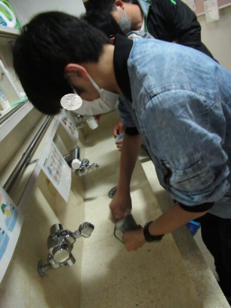 寄宿舎では、普段掃除をしていない場所や物をきれいにする日として愛舎日を設けています。今年度第2回目は「洗面台周辺をきれいにしよう!」と題して、2人ずつのグループに分かれて洗面台と鏡の掃除をしました。グループで協力して洗剤とたわしで洗面台をきれいにしたり、新聞紙を使って鏡をピカピカにしたりしました。その後、いつも使っている歯ブラシの確認をしたり、コップの汚れを丁寧に洗ったりしました。