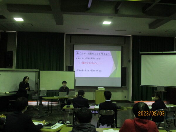 山梨県立ろう学校 > 活動の様子 > 第二回進路学習会(高等部) 2023年2月3日カテゴリー: 活動の様子 第二回進路学習会(高等部) 2月3日に第二回進路学習会(高等部)を交流ホールで行いました。 働く意味はなんなのか? 働くうえで大切なことなど集中して話を聞くことができました。 貴重なお話をしていただきありがとうございました。