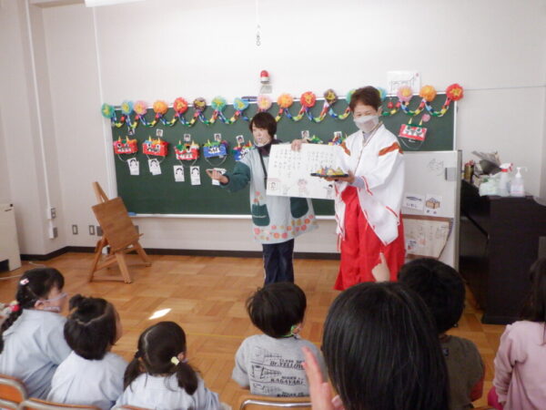 山梨県立ろう学校 > 活動の様子 > 幼稚部 まめまき 2023年2月6日カテゴリー: 活動の様子 幼稚部 まめまき 2月1日に幼稚部でまめまきをしました。 「おなかのなかに おにがいる」の絵本を読んだ後、自分のお腹の中にいる鬼(食いしん坊鬼、おこりんぼう鬼、立ち歩き鬼等)を発表しました。 その後、本物の鬼が登場し、豆をまいて玄関まで追い払いました。 鬼がいなくなった後、福の神がやってきました。 楽しい節分行事でした。