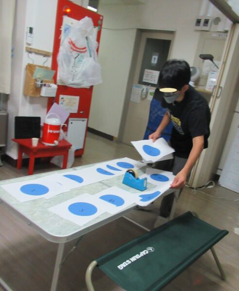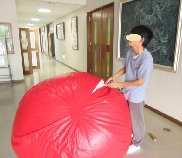お楽しみ会前には現場実習で高等部2・3年生が不在となってしまうこともあり、準備は高等部1年生を中心に行いました。係を分担し、カラオケを盛り上げるための楽器を借りてくる人、タイヤ用のエアーを使って大玉を膨らませる人、得点札を作る人、それぞれが計画に合わせて準備を進めてきました。