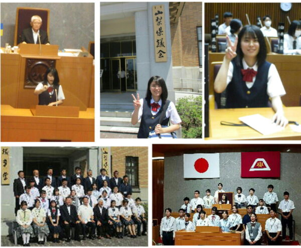 山梨県議会議事堂で高校生議会が開催され、県内15校の代表生徒が、山梨県議会議員の方の前で、山梨県の将来に向けた提言をしました。本校からは生徒会副会長の鈴木さんが参加し、『手話言語の普及啓発について』をテーマに提言をしました。独特の緊張感に包まれる議事堂内でしたが、堂々とした発表でした。とても貴重な主権者教育の機会を得ることができました。