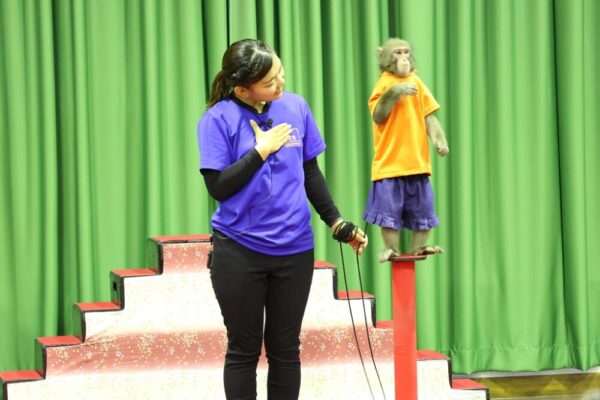9月4日(月)、本校において、二助企画による猿まわし公演が行われました。「走れ!ウキウキお猿の宅配便」の活動として、本校が全国で5番目の目的地ということでした。