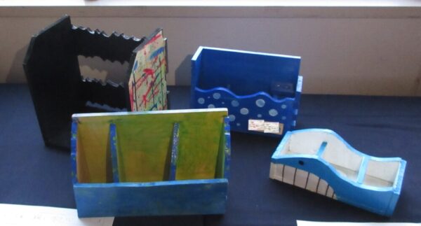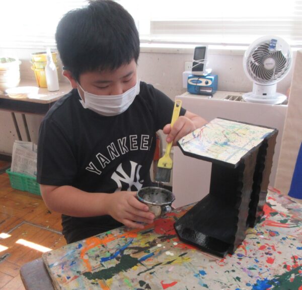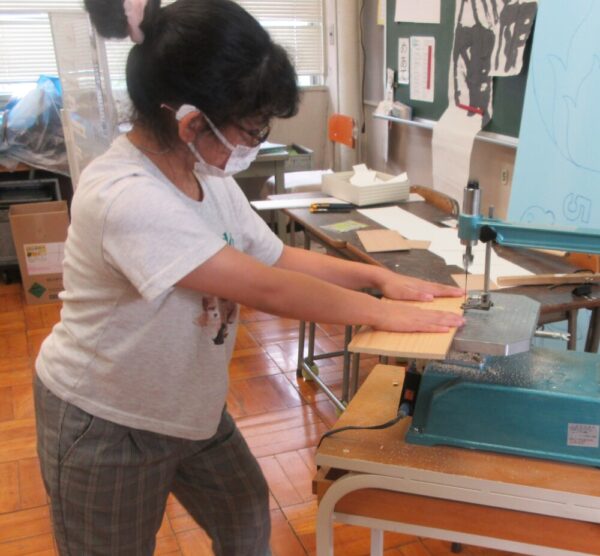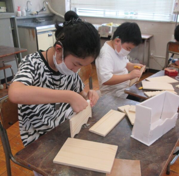 小学部6年生図工「1枚の板から」です。設計図をかき、のこぎりや電動のこぎりを使って、本立てや鉛筆立てなど、思い思いに作りました。
