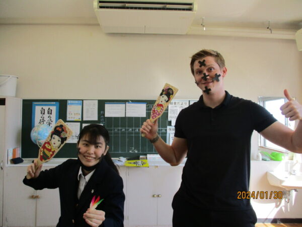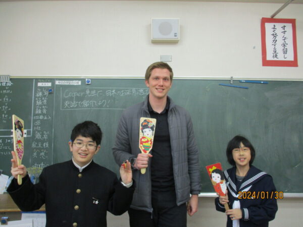 中高の授業では、生徒たちが自分が紹介したい日本のお正月の遊びを、英語でCooper先生に紹介することができました。その後、そのいくつかのお正月遊びを一緒にして楽しみました。