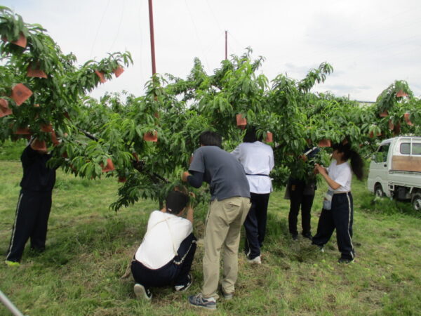 大野地区広瀬様の桃畑をお借りし、桃の袋掛け作業を体験させていただきました。