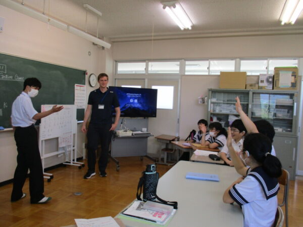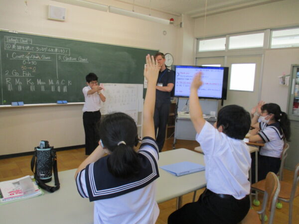 中学部では、3クラス合同で3つのゲーム(Count Game/ GO FISH/ Gesture Game)を英語でしました。それぞれ覚えた英語を駆使しながら、作戦を立てて楽しくプレイしていました。最後のジェスチャーゲームは、出題者の迫真の演技に様々な解答が出て、大いに盛り上がりました。